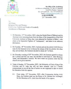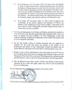 Should Father Tatah remain captive by Friday, Navember 29, His Grace himself, accompanied by the entire presbyterate, religious orders, and the lay faithful of the Archdiocese, shall undertake a mass pilgrimage to Baba 1, marching directly to the location of Father Tatah’s detention. They shall either secure his release or maintain vigil at the site indefinitely‚ a display of unified determination that defies the captors to perpetrate violence against thousands of peaceful Christians.