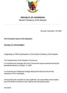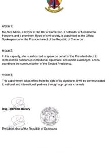This appointment, formalized by a decree from the self-proclaimed president -elect officially authorizes Barrister Nkom to represent Tchiroma’s positions in all institutional, diplomatic and media exchanges , effectively making her the chief coordinator of communication for the parallel presidency.